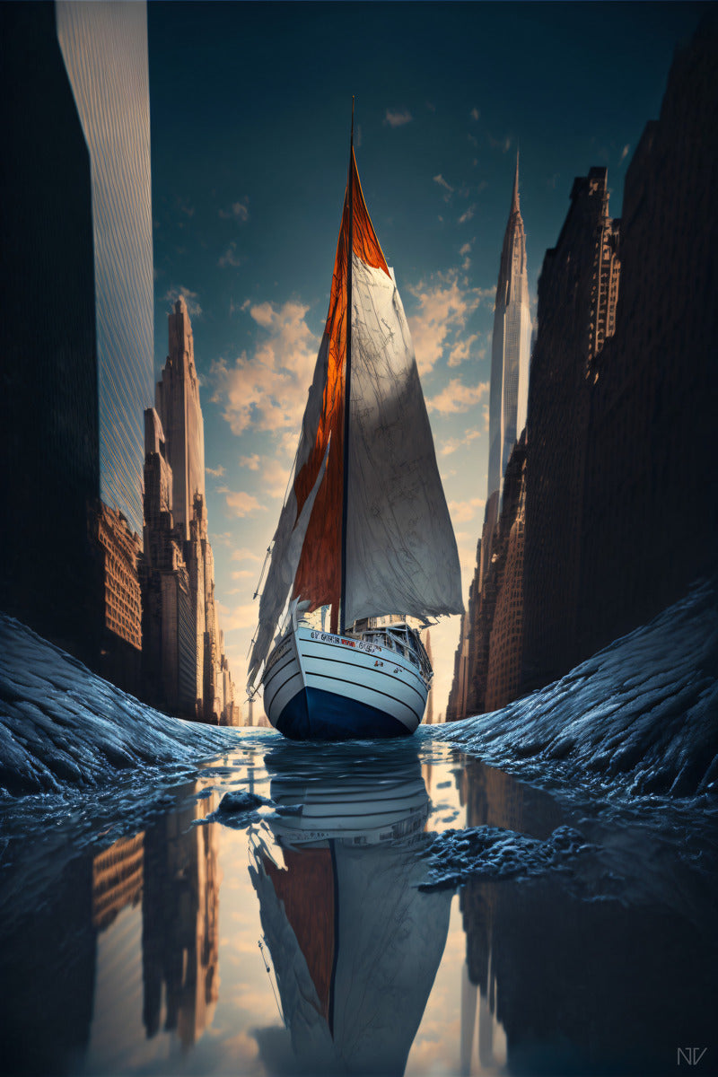 Un voilier naviguant dans une rue aléatoire inondée à New York Manhattan.