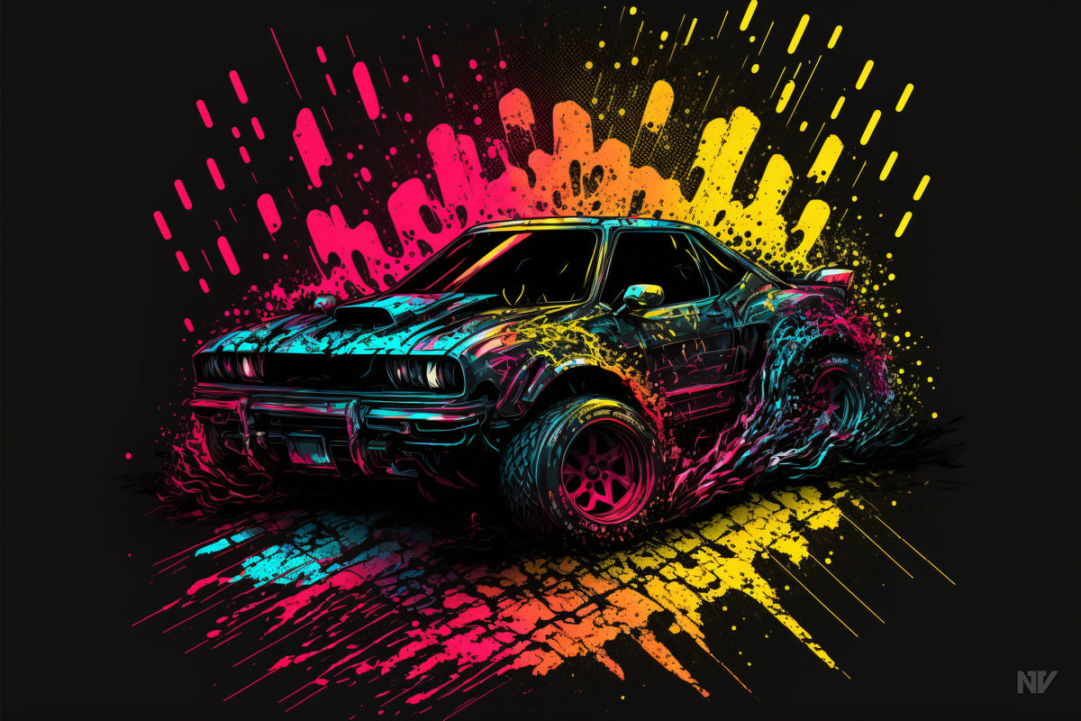 A muscle car poster Inspired from the Spectralism and Graffiti art style with a touch of neon effect.